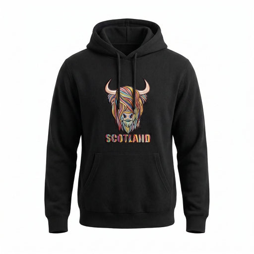 The Adults Pastel Highland Cow Hooded Top Black combines classic comfort with a bold Scottish-inspired design. Crafted from a soft and durable cott...